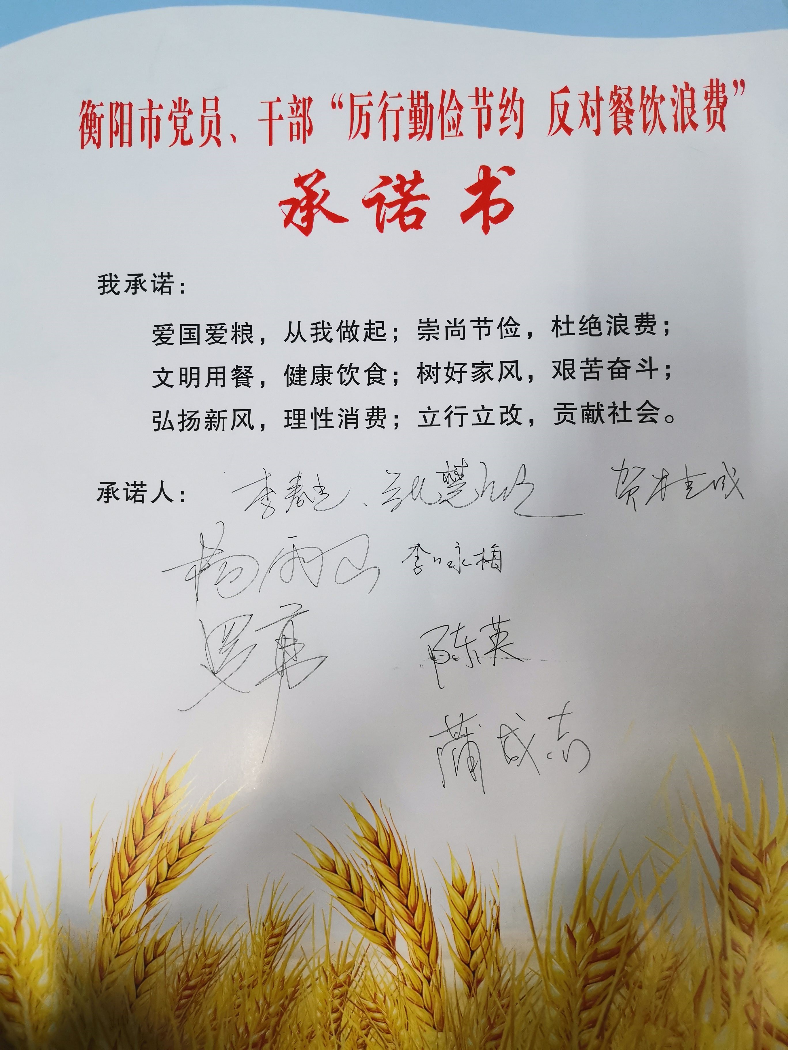集中学习后,支部党员集体签署了《党员、干部“厉行勤俭节约 反对餐饮浪费”承诺书》,就带头厉行节约、反对浪费;带头爱惜粮食,践行“光盘行动”,杜绝“舌尖上的浪费”;带头遵守中央八项规定及其实施细则精神,严格执行公务接待制度;带头弘扬艰苦朴素、勤俭持家的良好家风,倡导文明新风等作出公开承诺。