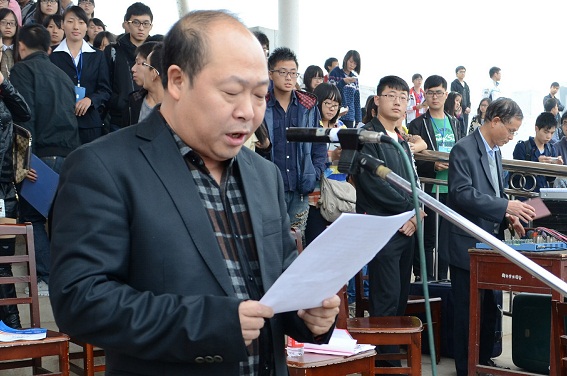 紧接着大会组委会主任、校长文格波宣布南华大学“阳光体育”系列活动之一——2013年大学生田径运动会开幕。随后大会组委会副主任、 副校长刘升学致开幕词。他阐述了运动对人类各项事业发展的作用,并号召全体师生都行动起来,将南华大学建设成为高水平高质量的大学。他对精心筹备大运会的工作人员表示诚挚的谢意,同时也对运动员、裁判员提出了要求。此外,他还强调青年大学生应当完善自我,通过这次比赛赛出风格,赛出精彩,赛出友谊。最后他预祝本届田径运动会取得圆满成功。