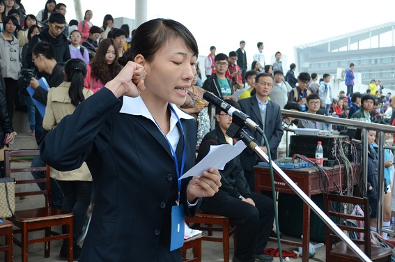 踏着高昂激情的音乐,国旗队、会徽队、标语队、鲜花队、会旗队、彩旗队、裁判员代表队依次进场,紧随其后的则是各学院的运动员代表队,他们身着本学院的特色服装,喊着响亮的口号,英姿飒爽,带着坚定的信念昂首阔步走过主席台。