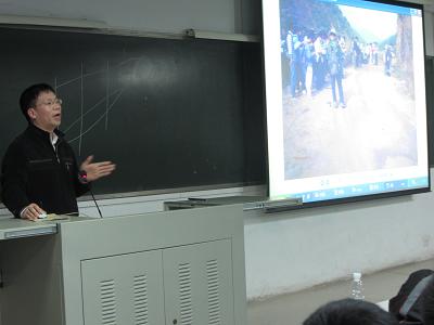 “我们有火焰般的热情,战胜了一切疲劳和寒冷”,一曲勘探者之歌,拉开了资源勘测神秘的面纱。首先,冯志刚老师发表了热情洋溢的讲话,向大家阐述了有关资源勘测专业的定位、意义和作用,在就业去向、实践教学和理论课程等几个方面仔细解释了资源勘测在现在、未来的学习、生活、工作状态。接着,谢焱石老师向大家展示了资源勘测专业大学四年的课程安排,简要解说了各课程的相关内容。然后,大家一起观看了学长们充满热情与活力的野外勘探照片,使大家对野外勘探都充满了向往。