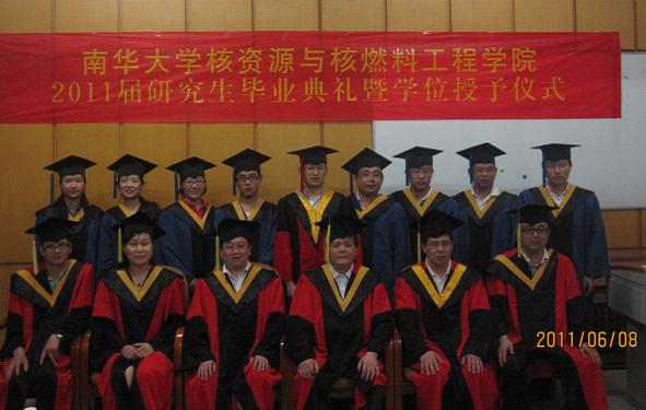 在庄严的国歌声中,2011届研究生毕业典礼暨学位授予仪式正式开始。校研究生处刘永副处长宣读了学校学位评定委员会关于学位授予的决定。决定指出,经学校学位评定委员会决定,分别授予曾晟1名同学博士学位,授予公新忠等11名同学硕士学位。谭凯旋院长向全体毕业研究生表示了祝贺并鼓励他们在科研的道路上继续探索,祝福研究生们今后事业辉煌、前程似锦。随后毕业研究生赵玉容发言,回顾了在母校求学期间的点点滴滴,代表全体毕业生对老师们的辛勤培养和教育表示衷心的感谢,立志将继续传承“勤勉务实,甘于奉献,刚健自强,敢为人先”的南华精神。丁校长做了重要讲话,代表学校向顺利完成学业的博士和硕士表示热烈的祝贺,向教学的老师们表示衷心的感谢,并对全体研究生提出了两点殷切的希望:第一,以犹太人在诺贝尔奖方面取得的辉煌成就为例,希望同学们能多读书,读好书;第二,希望同学们能时刻牢记“三首歌”,即“中华人民共和国国歌”、“国际歌”和西游记的主题曲“敢问路在何方”,要求同学们时刻具有危机意识、奋斗意识,要踏踏实实做人、扎扎实实做事。苏玲书记在总结丁校长讲话的基础上,对毕业研究生赠予了美好的祝福。