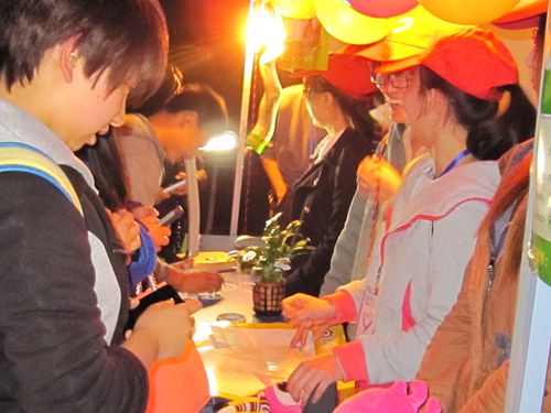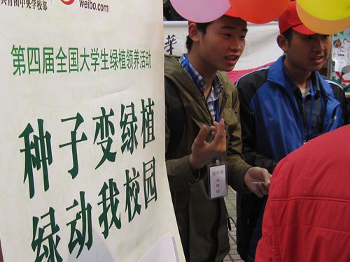 在北校灯光球场,现场的志愿者认真负责的给驻足的同学介绍活动的具体流程,请参加活动的同学写下自己的环保宣言。许多同学主动上前询问如何免费领取种子,怎样给绿色大使投票等问题。同学们领取种子,用微博记录下其点滴成长,与更多的人分享,将关爱地球的理念传递给更多的人。相信通过广大学子的不懈努力和推进,未来将有更多更美的蓝天。