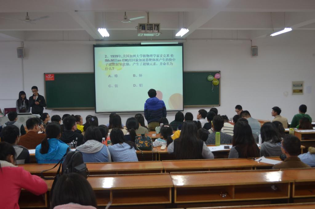 为激励广大在校大学生崇尚科学、追求真知、勤奋好学、迎接挑战。11月22日,由南华大学核资源工程学院与公共卫生学院共同主办的“科技知识竞赛”初赛于南华大学雨母校区逸夫楼302室隆重举行。莅临本次大赛的嘉宾有:核资源工程学院团委副书记陈博文,公共卫生学院团委副书记宋晓华,公共卫生学院科协主席郑凯。到场人员还有全体参赛选手。