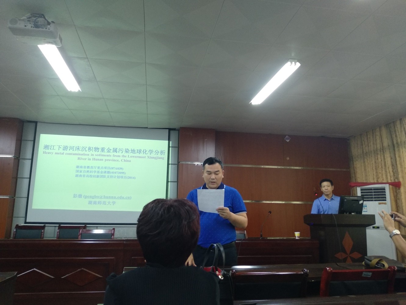 应地质勘探工程系谭凯旋教授邀请,湖南师范大学彭渤教授于6月13日(周四)上午10:30-11:30在设艺学院二楼会议室为我院师生做了一场精彩的重金属污染专题学术报告。我院科研副院长贺桂成副教授主持报告会。报告题目为:湘江下游河床沉积物重金属污染地球化学分析。该报告从研究背景、研究区概况、方法(样品和分析)、重金属污染特征及重金属污染铅同位素示踪等方面展开。报告最后,彭教授与相关老师在沉积物定年、采样方法及重金属污染对人体毒害机理等方面开展了交流探讨。