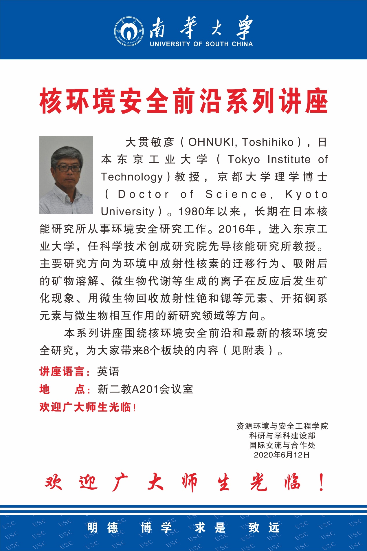 6月15日上午9时,由日本东京工业大学大贯敏彦教授主讲的核环境安全前沿系列讲座在资源环境与安全工程学院新二教A201会议室顺利开讲。该系列讲座原定于本月由大贯教授来校工作期间面授进行,受新型冠状肺炎疫情影响,国内外间交通受阻,同时,也为了疫情防控工作的需要,讲座改为邀请大贯教授以“虚拟来华”方式线上进行。