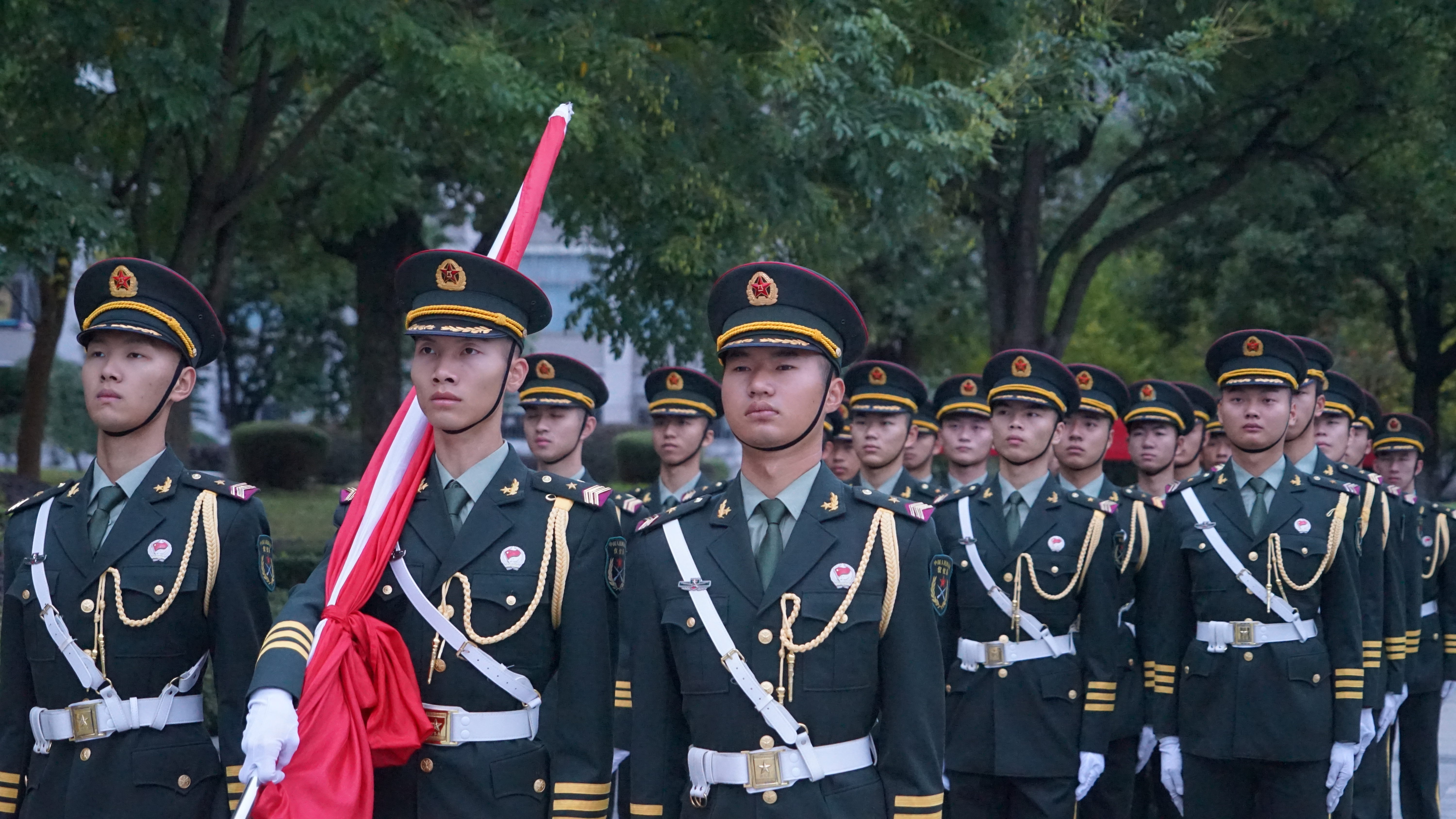 6:50,升旗仪式正式开始。大会第一项由国旗护卫队出旗,随着激扬的进行曲,民兵预备役的同学们迈着整齐的步伐向升旗台走来。伴随着《义勇军进行曲》的响起,全体同学高声齐唱,行注目礼,一片庄严肃穆。在国歌声中,五星红旗冉冉升起,飘扬在空中。