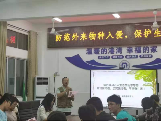9月7日晚上,资环安学院的张晓文老师、唐东山老师带领湖南省绿色卫士衡阳绿雁大队和学校环保协会的志愿者们在学院的多媒体会议室进行了主题宣讲,听众为大一大二学生和其他环保爱好者60余人。宣讲内容主要包括:一、 习近平生态文明思想与实践;二、 中华人民共和国生物安全法;三、防范外来物种入侵;四、保护生物多样性。宣讲之后,大家就“两山”理论以及当前关注的“鳄雀鳝”、“一枝黄花”等热点外来物种进行了热烈的提问、讨论等互动活动。