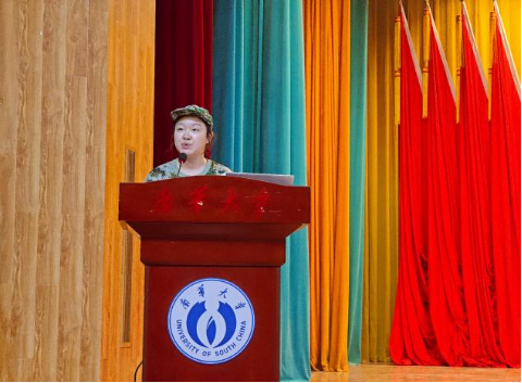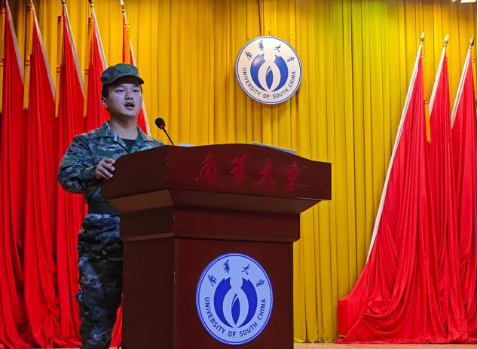 新生代表2025级安全工程专业余静怡同学发言,表达了对军训的期待与决心,并倡议全体新生以饱满热情和昂扬斗志投入训练,不负时代、不负韶华。