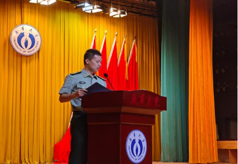 军训教官代表毛佳凯发言,他表示将秉承军队优良传统,以严明纪律和过硬作风科学施训、文明带训。