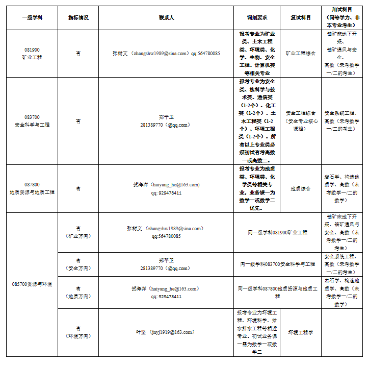 根据《2020年全国硕士研究生招生工作管理规定》(教学〔2019〕6号)、《南华大学2020年硕士研究生复试与录取工作方案》和《太阳成集团tyc,suncitygroup太阳2020年硕士研究生调剂公告》等要求,按照学校及我院研究生招生工作的复试方案,资源环境与安全工程学院矿业工程(081900)、安全科学与工程(083700)、地质资源与地质工程(081800)、资源与环境(085700,矿业工程方向、安全方向、地质资源与地质工程方向、环境工程方向)专业拟于2020年5月29日8:00至5月30日8:00之间开放硕士研究生招生调剂系统(调剂专业及要求见附表)。欢迎考生调剂到我院相关专业继续深造。