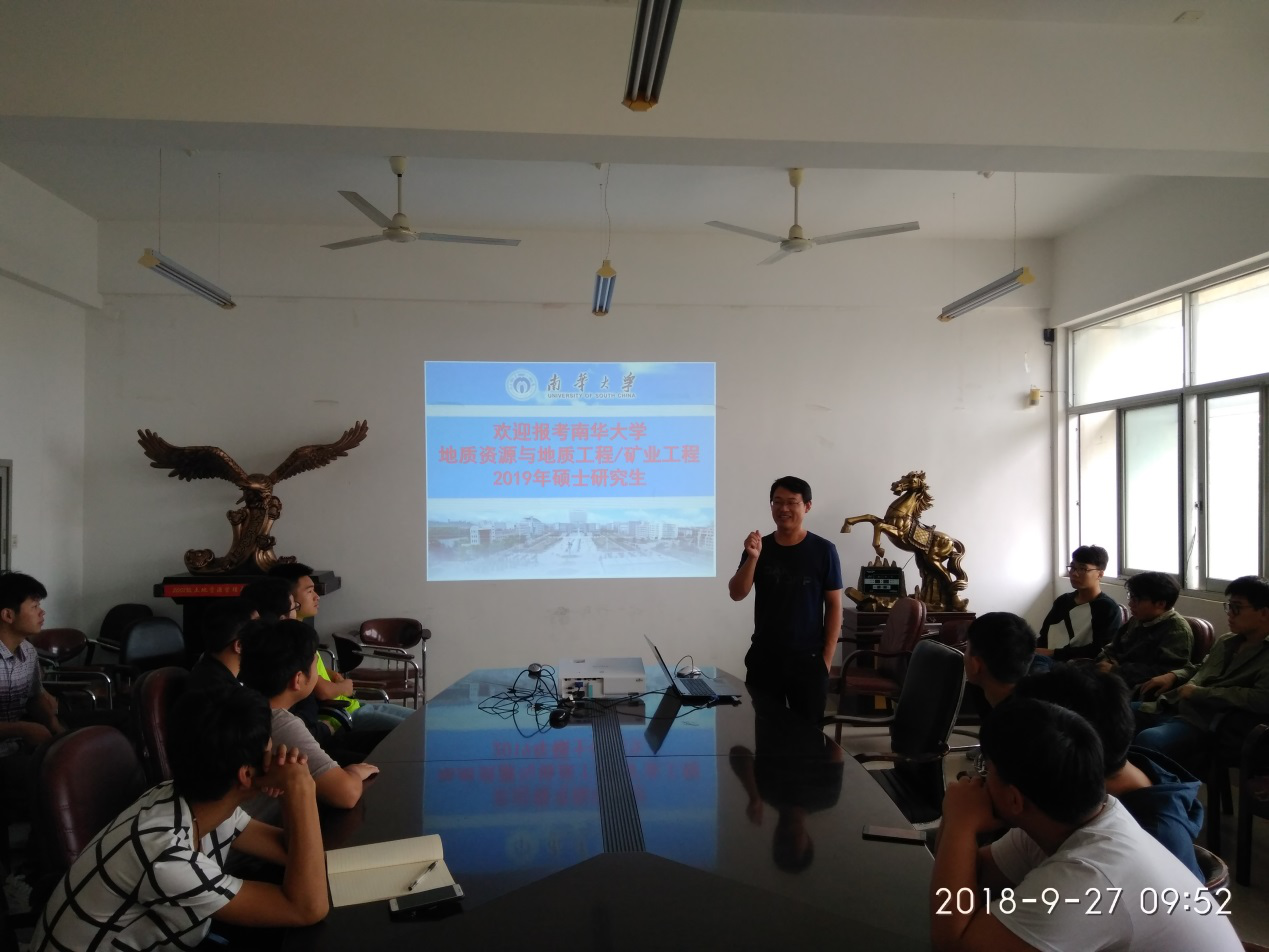 为了吸收优质生源来我院攻读硕士学位,9月26日,资源勘查工程专业王正庆老师与陈亮老师赴东华理工大学地球科学学院进行地质资源与地质工程/矿业工程硕士研究生招生宣传。宣传的主要内容包括:我校历史沿革、办学规模与层次、教研与科研水平及研究生培养与招生政策,我院科研实力及研究生招生优惠政策等。