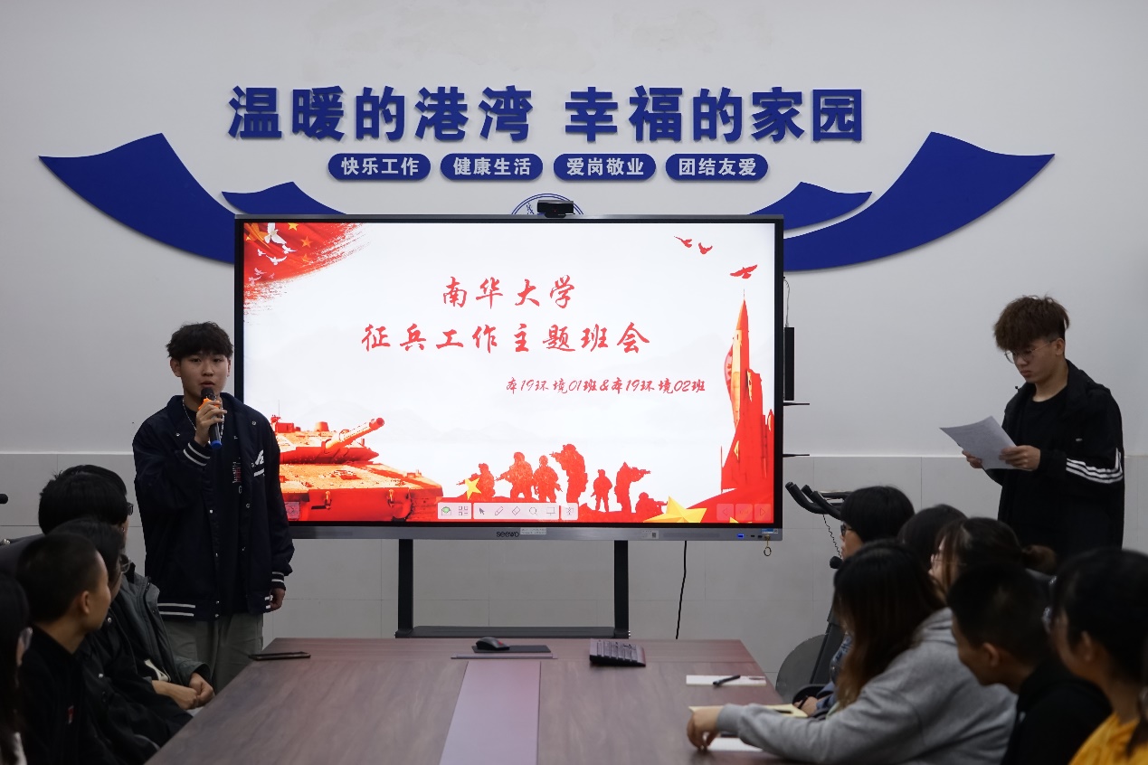 下半年的征兵来临之际,为了响应党和国家的号召,2021年4月19日星期一晚,资源环境与安全工程学院环境1901班和1902班在新二教A305教室联合开展以“征兵工作”为主题的班会。参会人员有:院党委副书记田生军、班主任叶坚老师、辅导员曹立佳老师、18级退伍学长曹星海、唐英杰、环境1901、1902班全体成员。