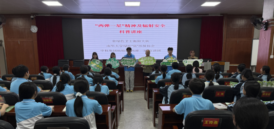 近日,湖南省“绿色卫士下三湘”系列活动走进衡阳市实验中学,南华大学核特岗“两弹一星”宣讲团携手绿色卫士衡阳大队,为150余名学子带来了一场融合“红色传承”与“绿色理念”的科普讲座,在青少年心中播撒科学与生态文明的种子。