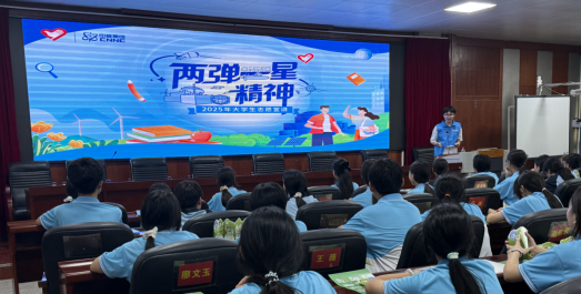 “两弹一星”宣讲环节将活动现场推向第一个高潮。主讲人龙仁政深情讲述钱学森、邓稼先、孙家栋等科学巨匠的奋斗故事。从毅然归国到扎根戈壁,从白手起家到突破重围,老一辈科技工作者将个人理想融入国家命运的感人事迹,让在座学子无不动容。一段段艰辛历程,一个个攻关故事,生动诠释了“热爱祖国、无私奉献,自力更生、艰苦奋斗,大力协同、勇于登攀”的“两弹一星”精神。宣讲人勉励同学们要以科学家为榜样,树立远大理想,将个人成长汇入国家发展的洪流。