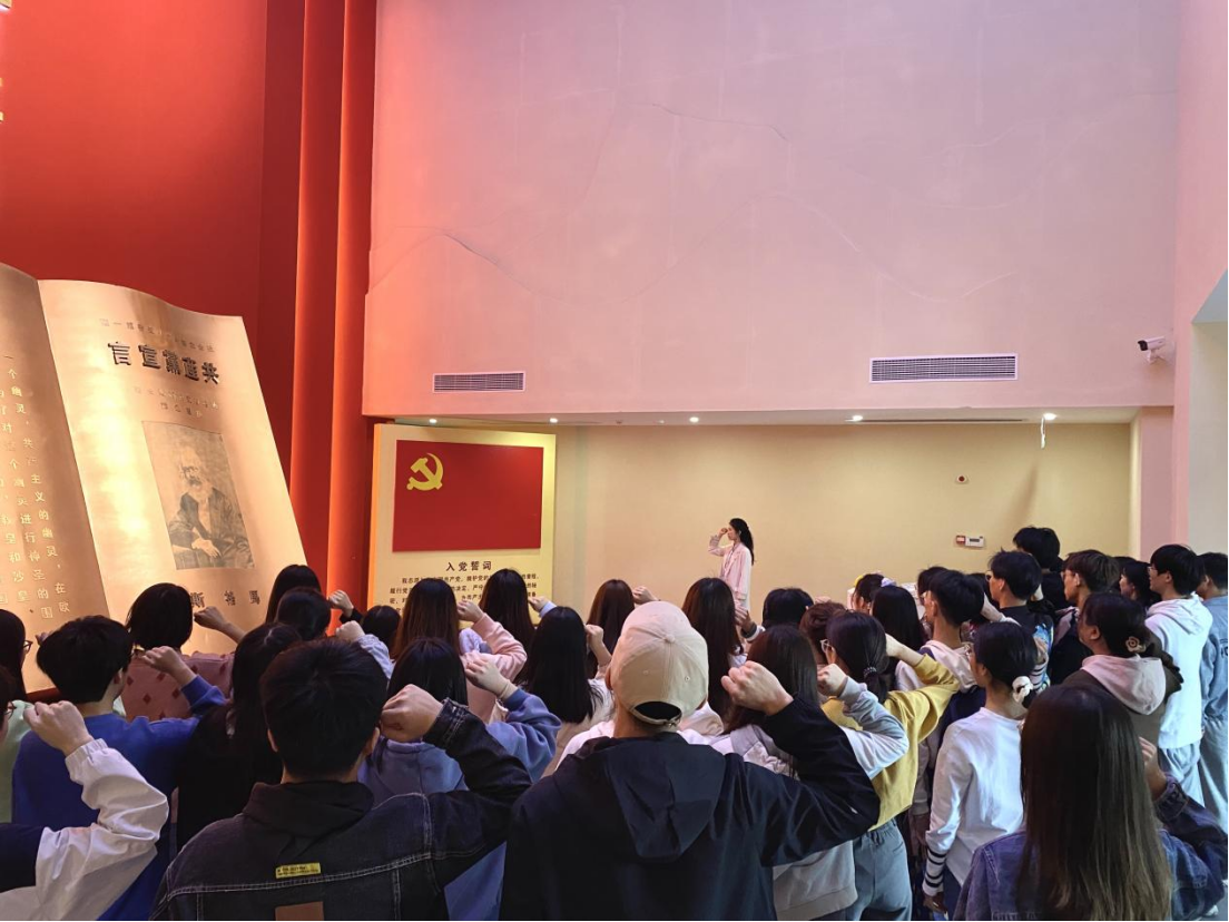 党员们进入党史陈列馆陈列大厅,巨大的《共产党宣言》模型屹立其中,金黄的灯光洒在这本书上,历史感扑面而来。面对党旗,支部书记王逸韵带领各位党员一起重温入党誓词,大家举起右拳郑重宣誓:“我志愿加入中国共产党,拥护党的纲领……永不叛党。”在铿锵的誓词中,党员的内心受到洗礼,入党初心更加坚定,责任感、使命感进一步增强。