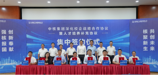 7月23日,中核集团校企人才培养补充协议签约仪式在中核集团人力资源共享中心西南分中心(中国核动力研究设计院)举行。中核集团党组成员、总会计师王学军,中国核动力研究设计院党委书记王丛林,核工业西南物理研究院党委书记刘叶,核工业学院党委书记左振宇及人力资源相关领导,联合清华大学、上海交通大学、浙江大学、西安交通大学、哈尔滨工程大学、南华大学、东华理工大学等七所高校领导及相关教师代表与会。南华大学陈国民副校长带领招生就业处、教务部、教育发展与校友联络办、资源环境与安全工程学院、核科学技术学院等部门相关人员参加活动,我院安全科学与工程学科带头人、教务部部长彭国文代表南华大学签署协议。